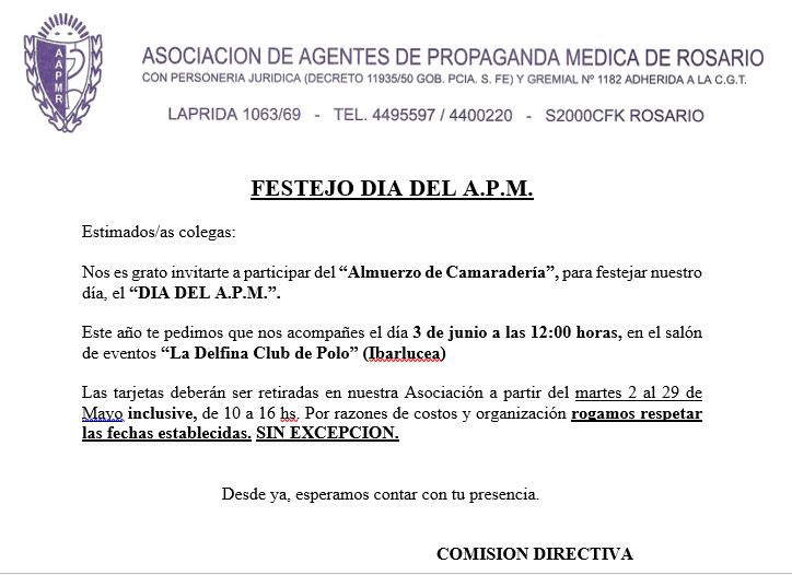 Queridos compañeros, con que placer los invitamos a un almuerzo de camaradería, para festejar nuestro día, el Día del A.P.M.